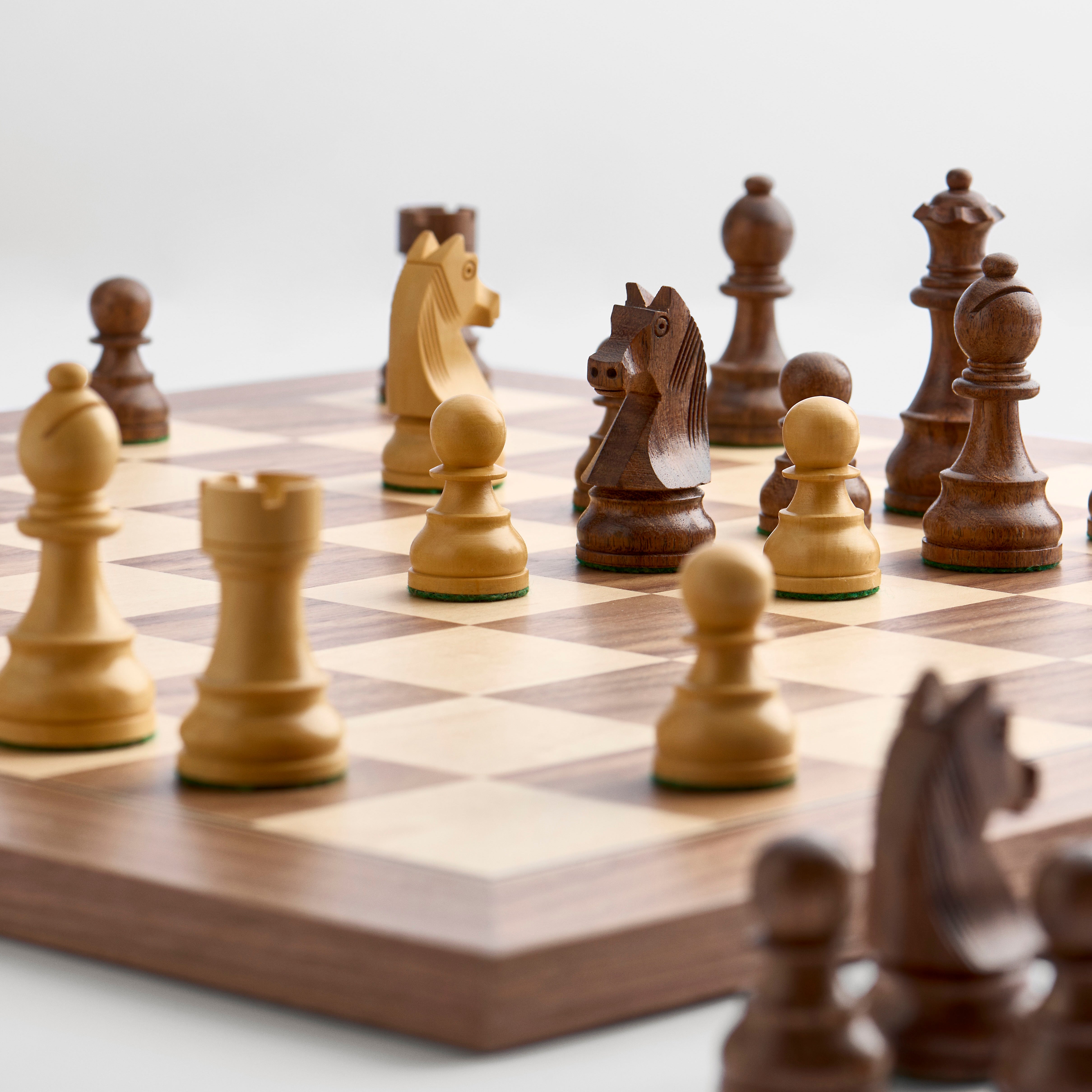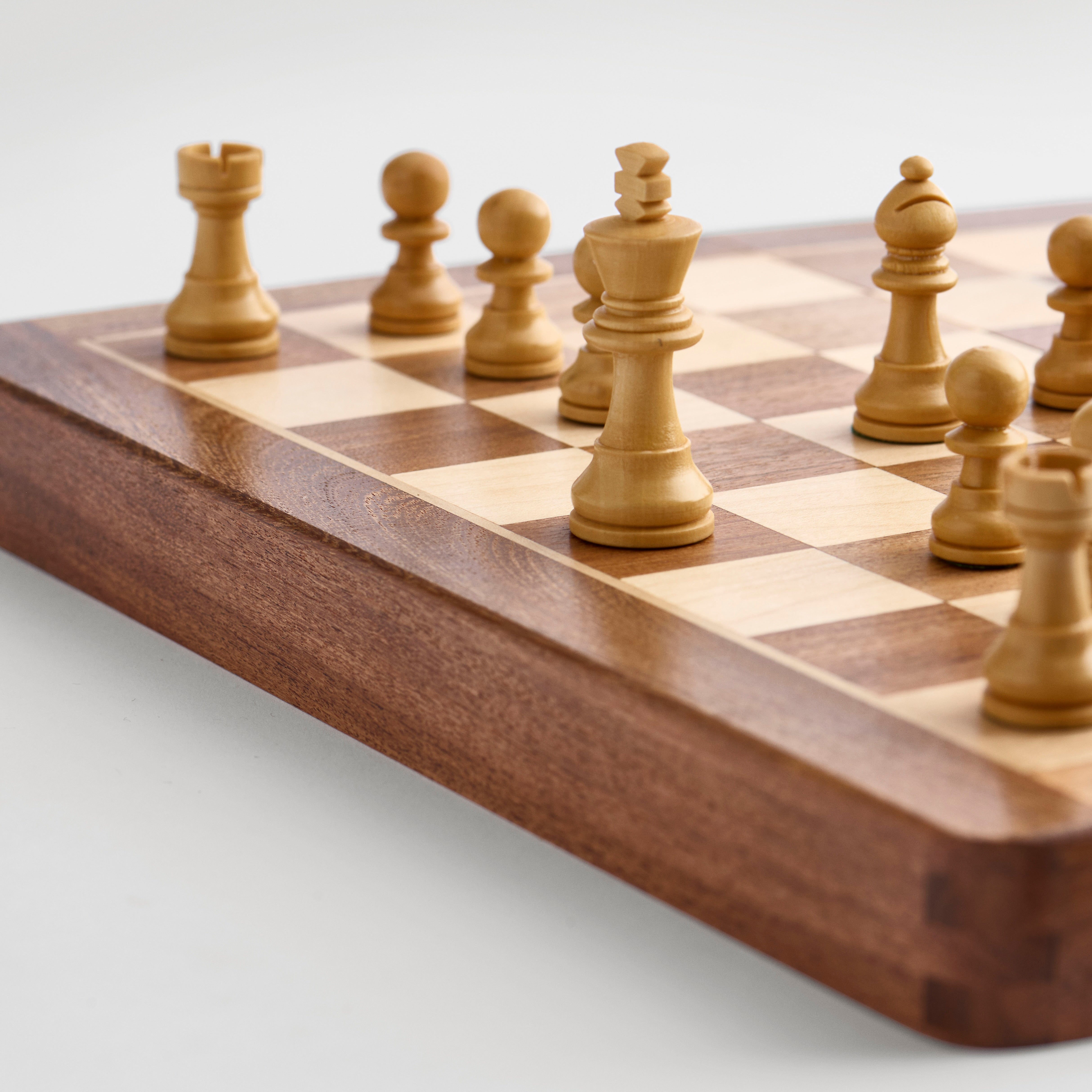 We use walnut, boxwood, acacia, and maple – woods with the right weight, structure, and strength for chess. Everything is made by hand in small workshops in India, where the craft is still passed on from generation to generation.